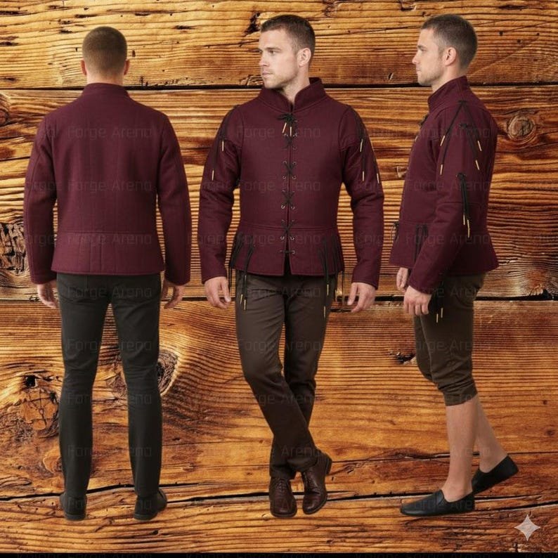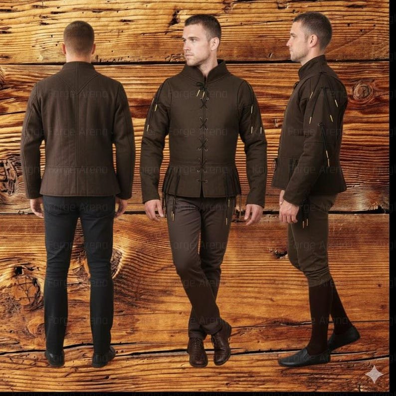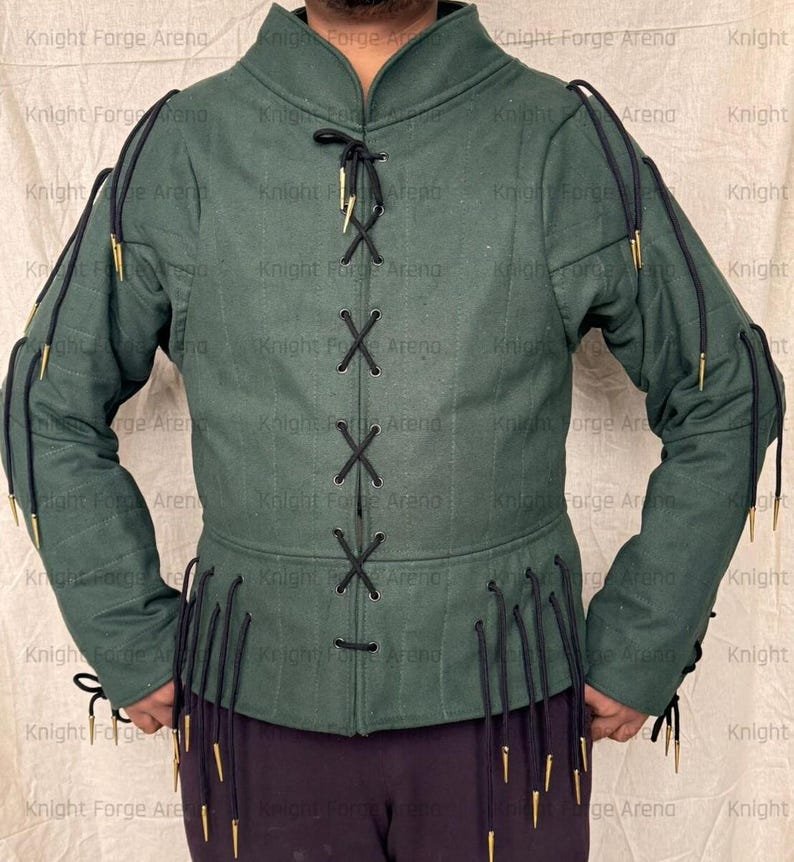 Unlike standard jackets, this doublet features historical lace-up closures finished with polished brass tips (aglets). These facilitate easy threading through arming points and prevent cord fraying under tension.