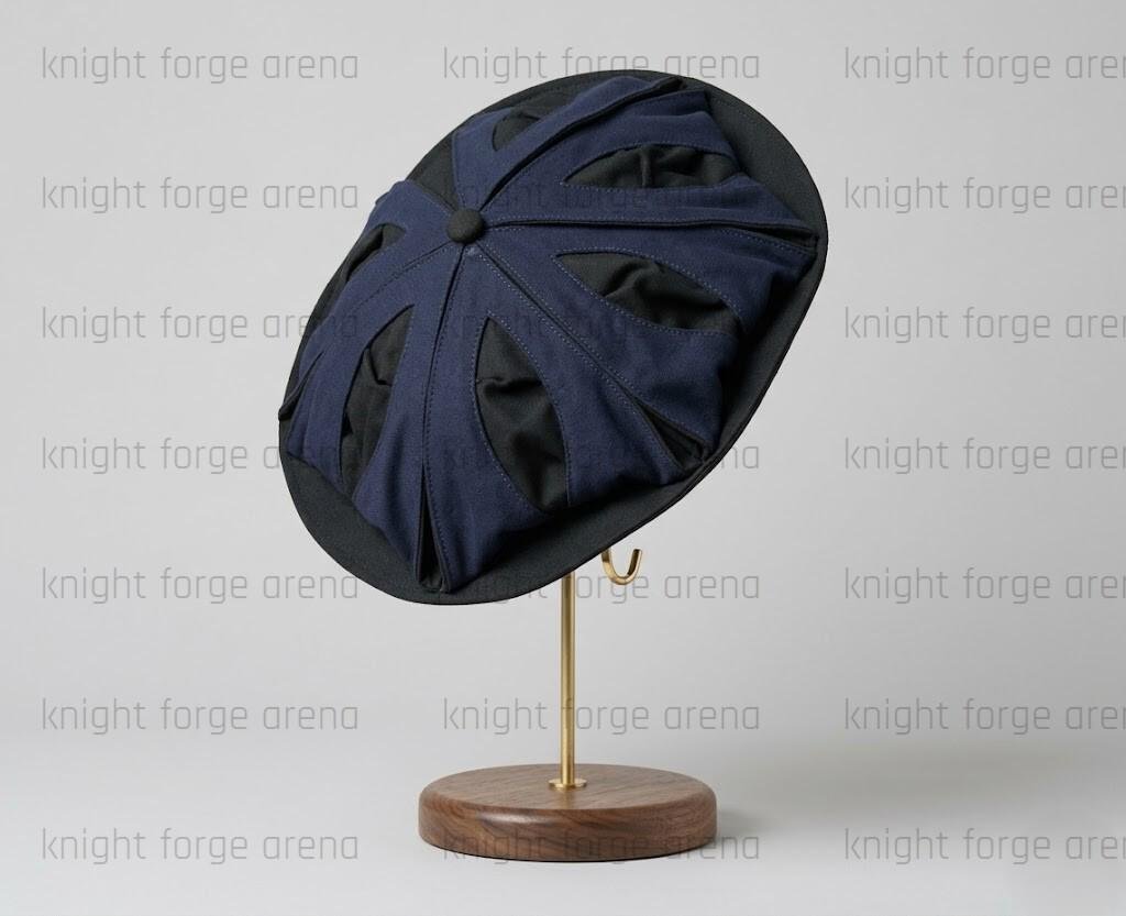 Hat: Structured Tudor-style beret with decorative slashing.