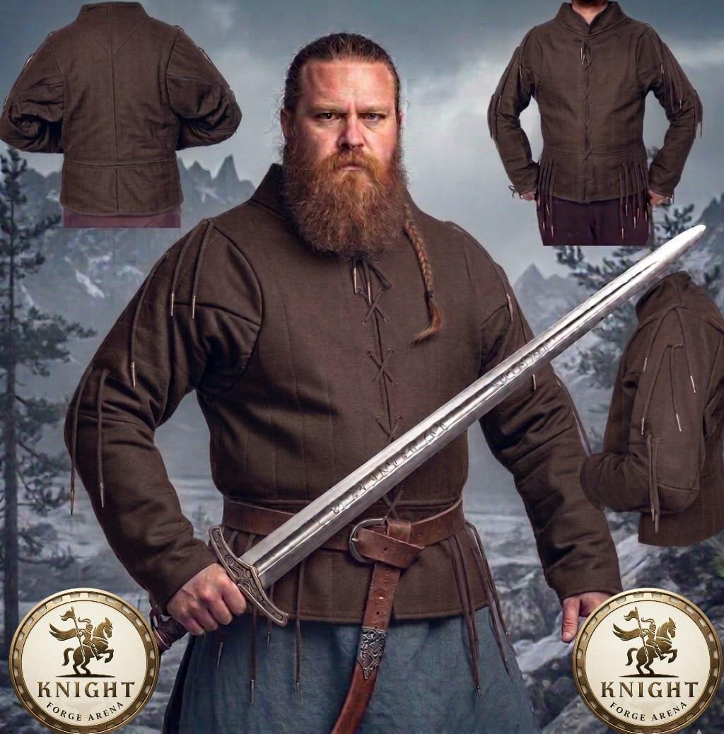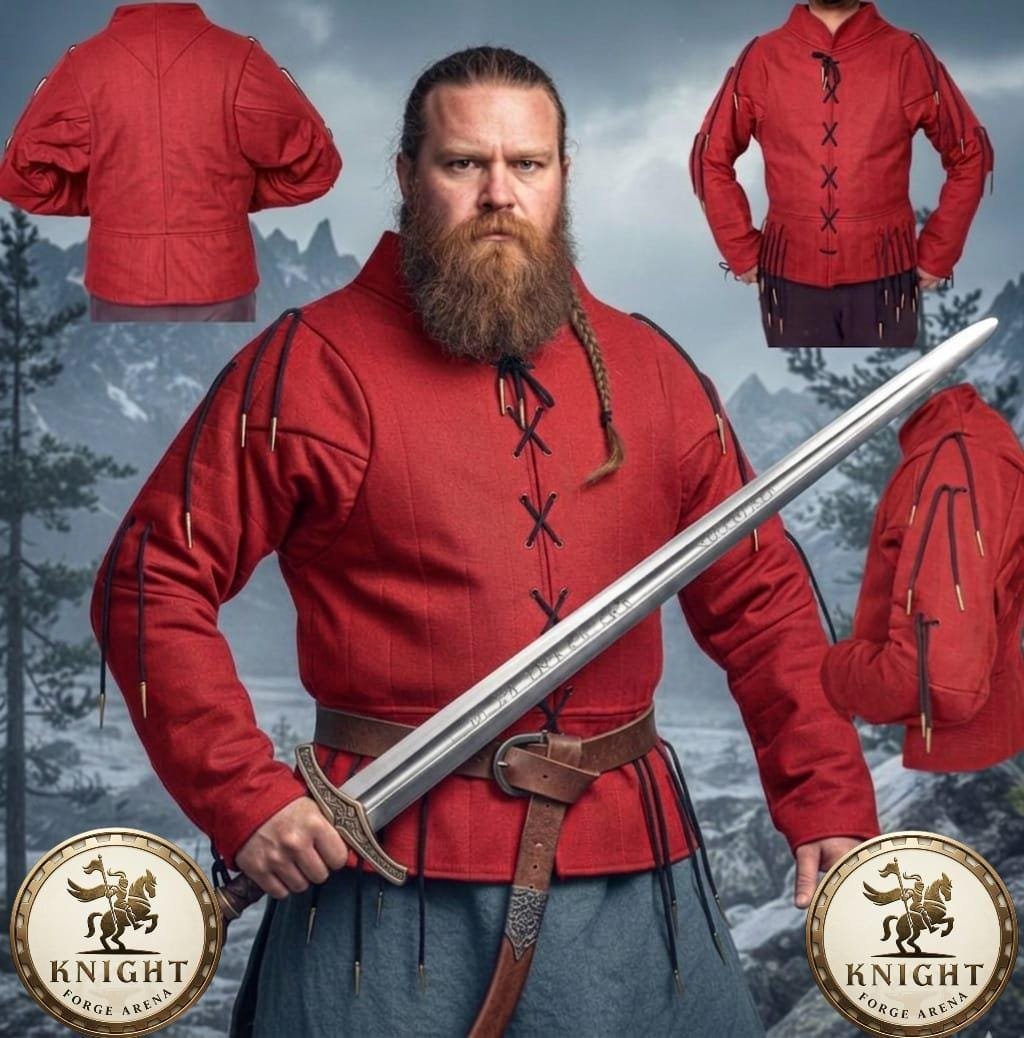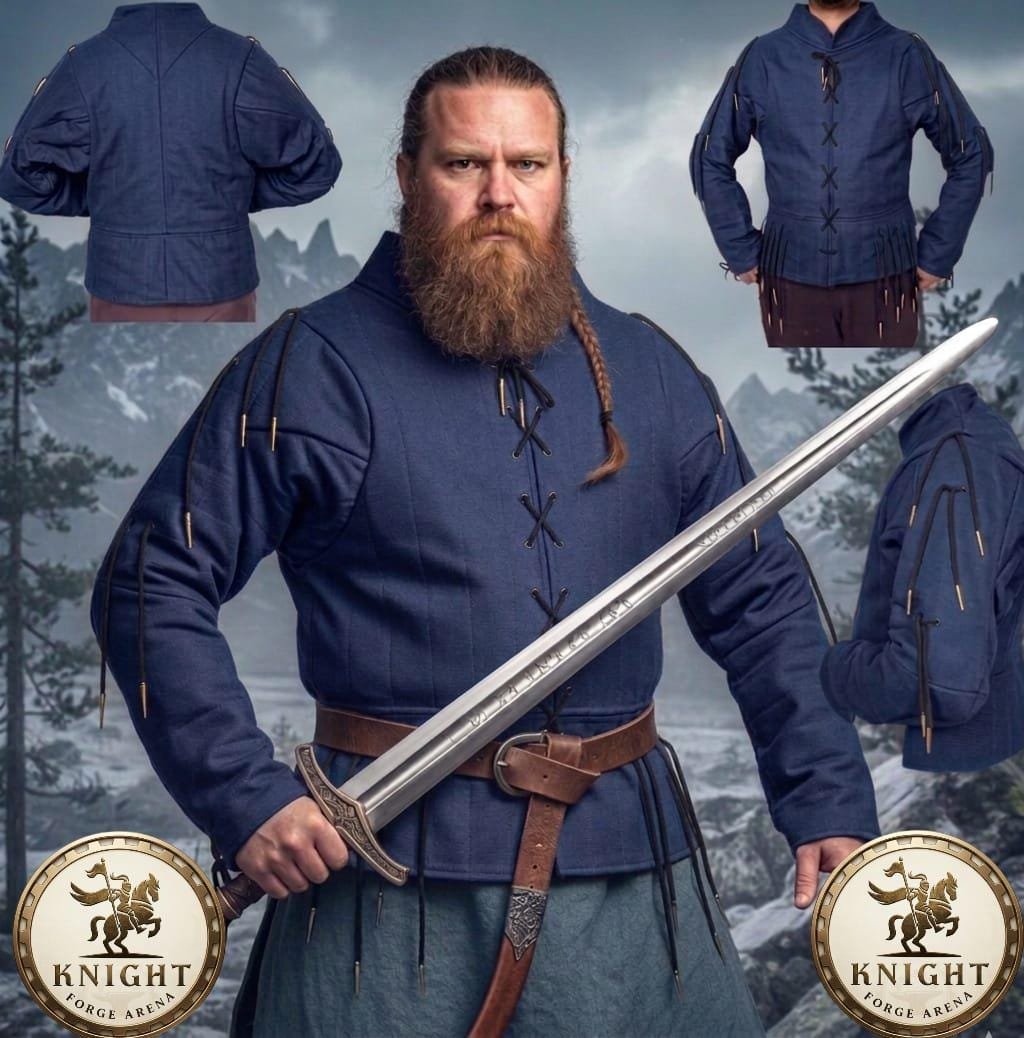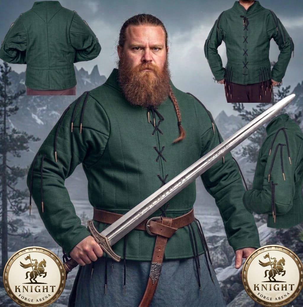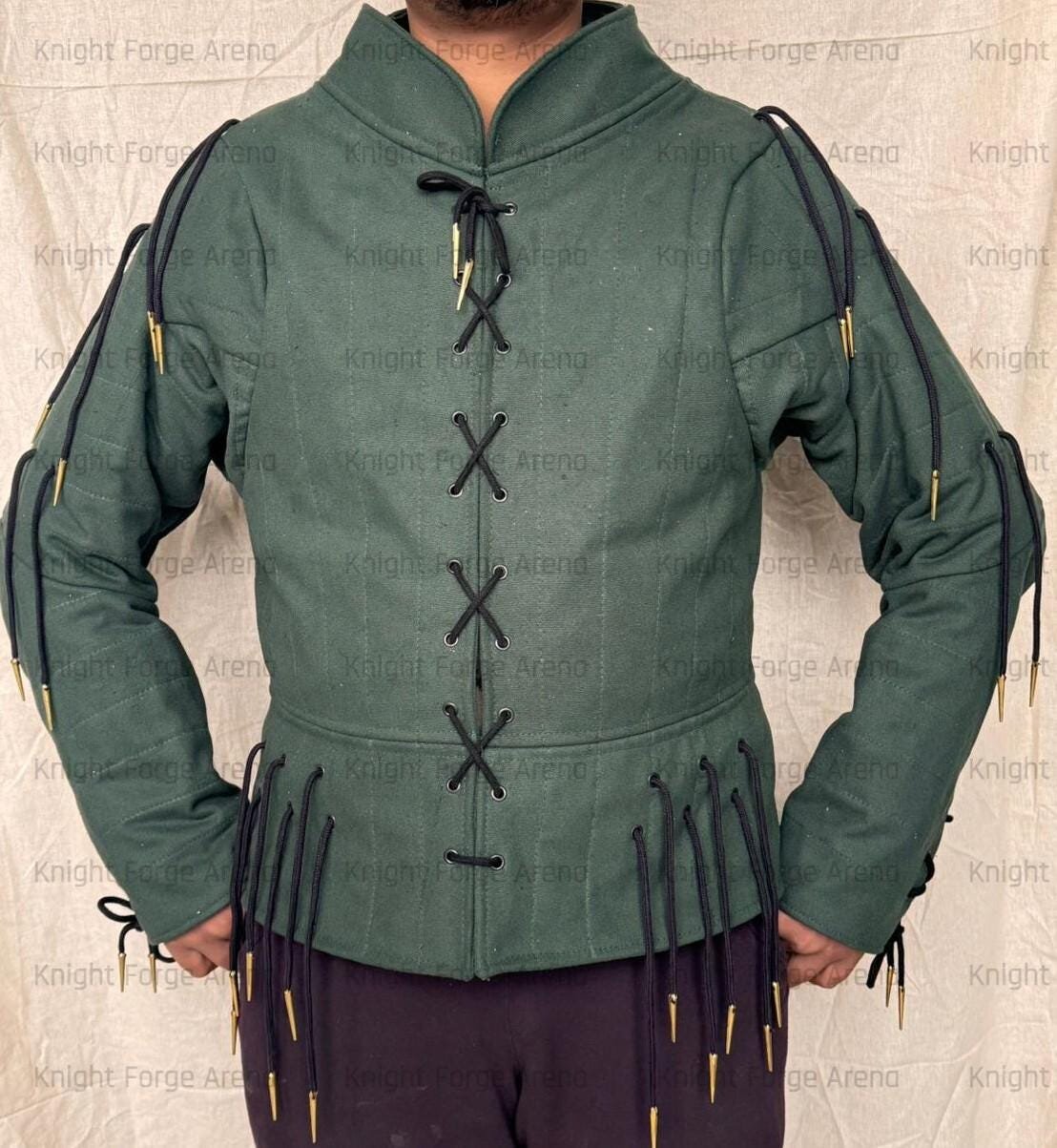 Handcrafted 14th Century Arming Doublet | Historical Padded JacketExperience the perfect blend of medieval utility and noble style. The KFA-1016 Arming Doublet is an expertly tailored garment designed for the modern historian. Whether you are layering it under a suit of plate armor or wearing it as a standalone piece at a Renaissance faire, this doublet provides the authentic silhouette and protection required for 14th-century impressions.Key FeaturesAuthentic 14th-Century Tailoring: Designed with a slim fit and padded construction typical of the Late Middle Ages, ensuring a sharp, historical profile.Signature Brass Tips: Each lacing point is finished with elegant, durable brass tips (aiglets), making it easy to lace and adding a touch of period-correct sophistication.Handcrafted Durability: Constructed from heavy-duty, breathable fabric and reinforced stitching, this jacket is built to withstand the movement and friction of reenactment and combat sports.Versatile Functionality: An essential foundation for HEMA (Historical European Martial Arts), LARP, or high-end theatrical productions.Technical SpecificationsAttributeDetailModel NumberKFA-1016MaterialPremium Padded Textile (Canvas/Cotton Blend)HardwarePolished Brass Aglets/TipsEraLate 14th to Early 15th CenturyClosureFront-lacing for an adjustable, secure fitImportant NotesHistorical Foundation: This doublet is designed to be worn snugly to the body to support the weight of armor or to be worn as a structured civilian garment.Color Variance: Please note that the fabric color may vary slightly from the product images due to studio lighting, screen settings, and the artisanal dyeing process.Upgrade your kit today. The KFA-1016 is more than a costume—it is a piece of living history.