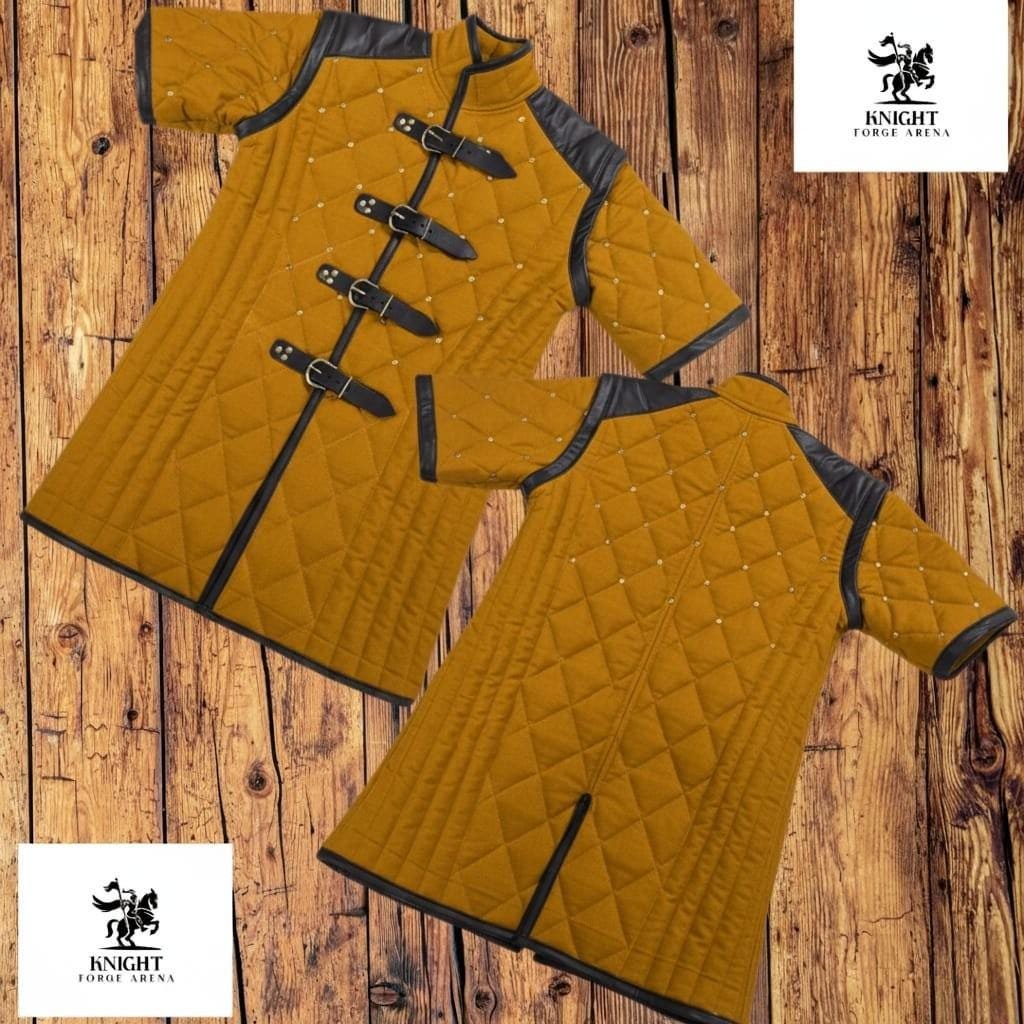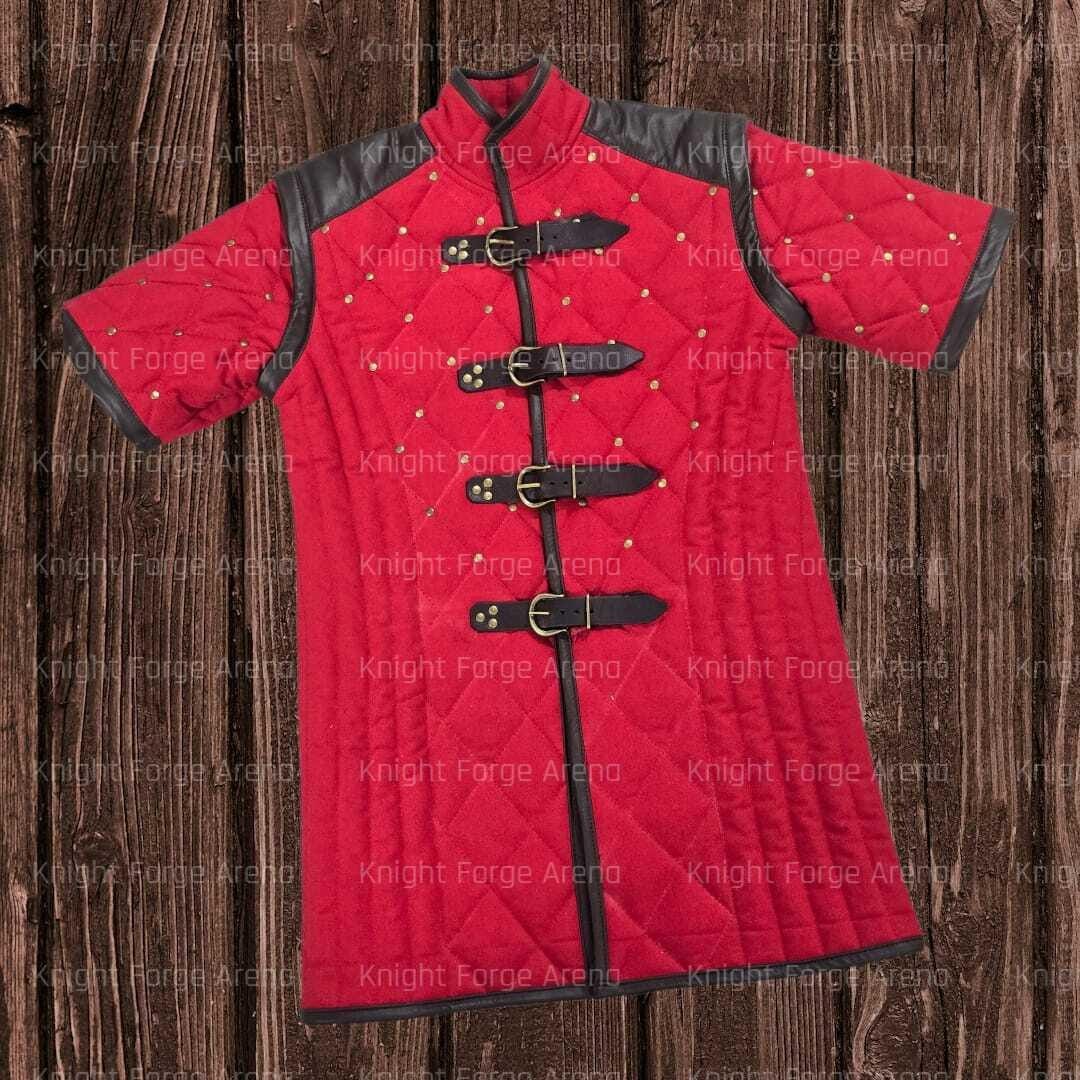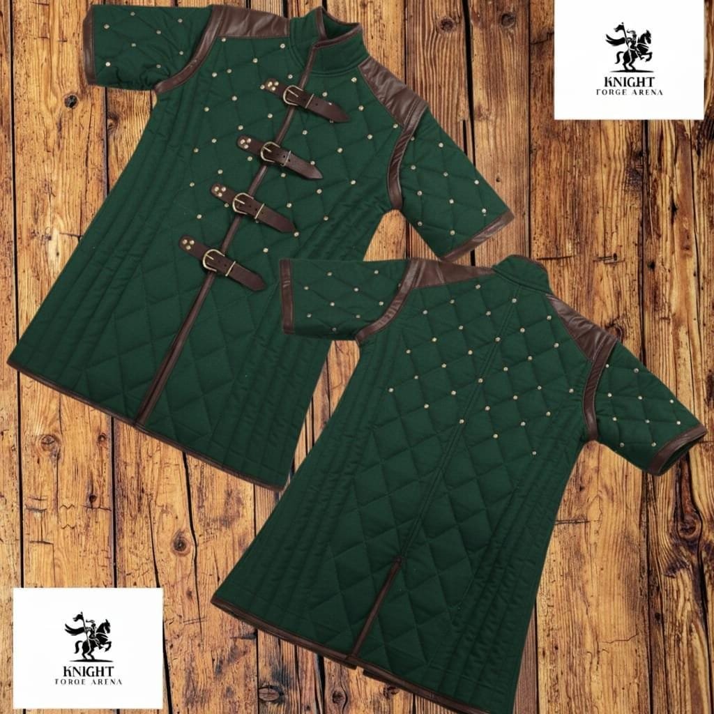 Handcrafted Viking Medieval Gambeson | Leather Detailed Armor Embrace the spirit of the North with the KFA-1006 Viking Gambeson. This rugged, handcrafted padded jack is designed for warriors who demand both protection and a commanding presence. Featuring premium leather accents, this gambeson serves as the ultimate defensive layer for Viking-age reenactments, LARP battles, or as an authentic foundation for heavy armor. Design & Craftsmanship Rugged Warrior Aesthetic: Unlike standard quilted jacks, the KFA-1006 features strategically placed leather details that provide extra durability and a distinct, tribal look. Superior Impact Protection: Constructed with multiple layers of high-quality padded cotton, designed to absorb shocks from blunted weapons or provide a cushioned barrier under chainmail. Mobile & Breathable: Engineered for the heat of battle. The tailored fit allows for a full range of motion in the shoulders and arms—essential for shield-wall maneuvers or swordplay. Period-Inspired Closure: Built with durable fastenings that maintain a secure fit during high-activity movement. Technical Specifications Feature Details Model NumberKFA-1006Primary -duty Padded Cotton Canvas Accents Genuine/Reinforced Leather Trim & Straps Historical Style Viking / Early Medieval / Norse Warrior Recommended Use HEMA, LARP, Viking Reenactment, Film/Stage Why Choose the KFA-1006?The transition from a simple tunic to a battle-ready warrior begins with your base layer. This gambeson doesn’t just look the part—it is built to withstand the rigors of the field. The leather reinforcement on high-wear areas ensures that your kit lasts through seasons of campaigning. Note on Craftsmanship: As each piece is handcrafted, slight variations in the leather grain and fabric shade may occur, making every gambeson uniquely yours .Complementary Gear To complete your Viking kit, this gambeson pairs perfectly with :Chainmail Hauberks (worn over the padding)Leather Bracers and Greaves Viking Spangenhelm or Spectacle Helmet.