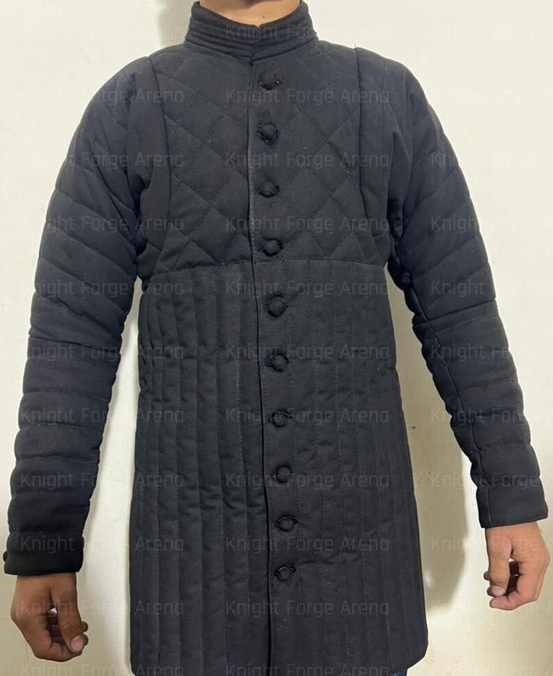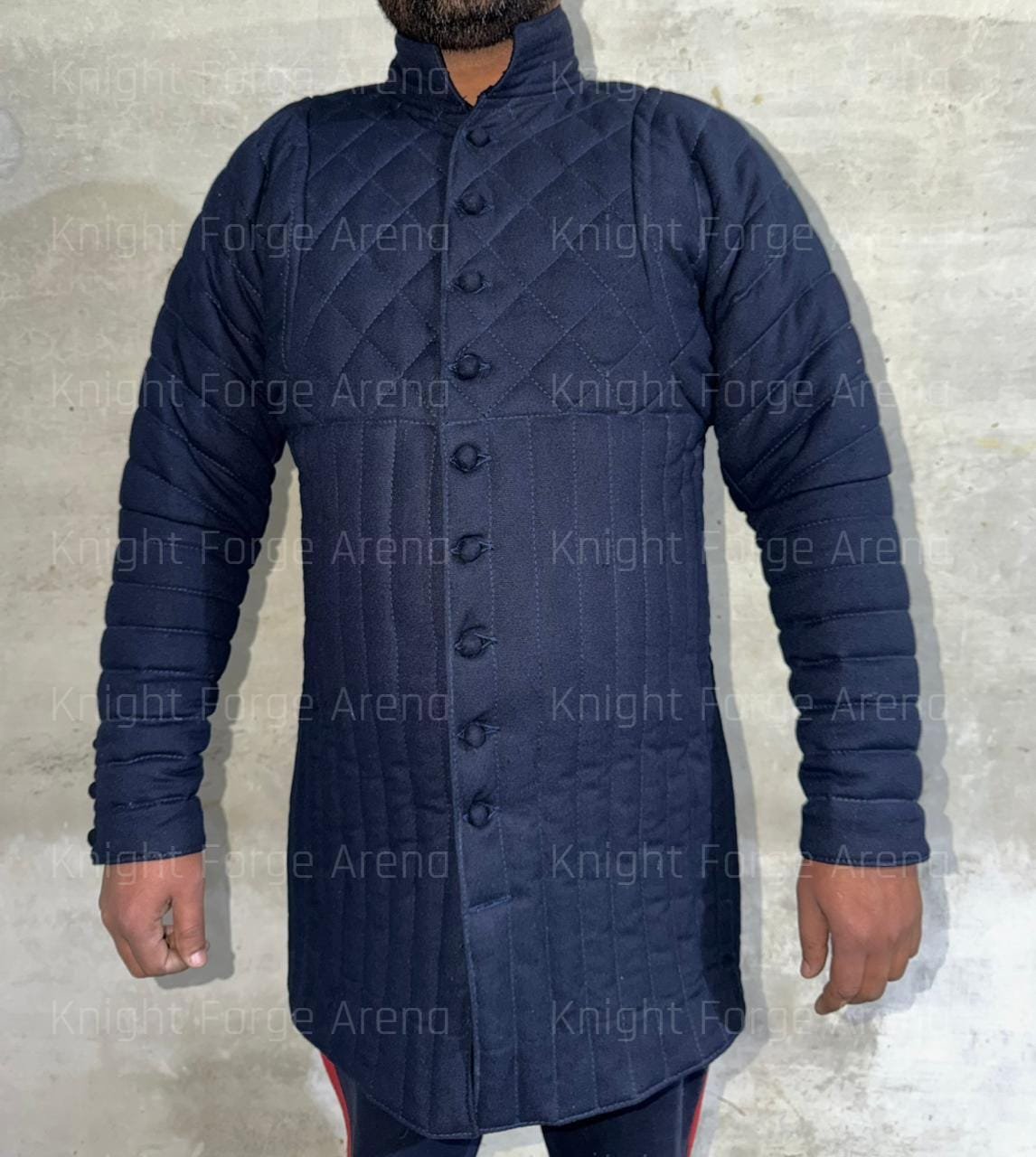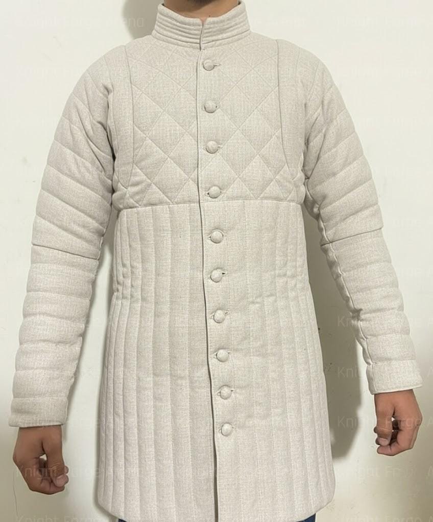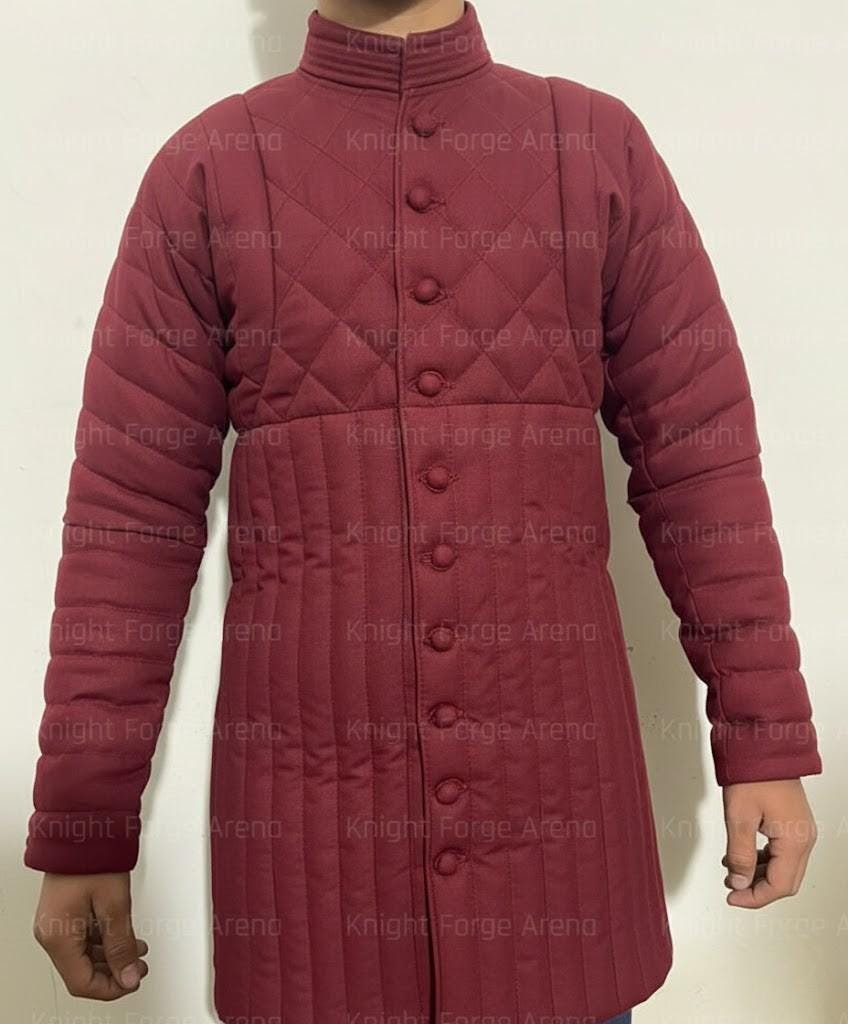 Handmade 14th Century Gambeson KFA-1011 | Heavy-Duty Combat Armor Step into the heart of history with the KFA-1011 14th Century Medieval Gambeson. This masterfully handcrafted padded armor jacket is the definitive choice for reenactors, HEMA practitioners, and history enthusiasts who demand both authenticity and battle-ready durability. Unlike standard costume pieces, the KFA-1011 is engineered for the rigors of Stage Combat and LARP, providing a high-density protective barrier that embodies the spirit of the Middle Ages. Its late-medieval silhouette offers a tailored, professional look that serves as the perfect foundation for a knight, mercenary, or man-at-arms persona. Why the KFA-1011 Stands Out: Heavy-Duty Impact Protection: Constructed with multi-layered padding to absorb shock from blunted weapons, making it ideal for full-contact training and competitive combat.14th Century Tailoring: Features a historically-inspired cut that provides the structured, tapered fit favored during the Hundred Years’ War, ensuring you look the part of a seasoned warrior. Maximum Combat Mobility: Strategically stitched to allow for a full range of motion in the shoulders and elbows—essential for high guards and rapid sword transitions. Breathable Professional Grade: Made from premium cotton canvas that offers superior durability while allowing for natural ventilation during intense physical exertion. Versatile Armor Base: Designed to be worn as a standalone “Jack” or as a comfortable arming garment under chainmail and plate harnesses to prevent pinching and weight fatigue.Technical SpecificationsFeatureDetailsModel NumberKFA-1011MaterialIndustrial-Strength Cotton Canvas ShellInternal Padding Natural Fiber Layered Filling Historical Period14th Century (High to Late Middle Ages)Closure Style Reinforced Front Fasteners Primary Use HEMA, LARP, Stage Combat, Full-Contact Reenactment Elevate Your Kit The KFA-1011 isn’t just a piece of clothing; it’s an essential piece of equipment. Its rugged construction ensures it will survive season after season of campaigning, while its striking medieval flair makes it a standout piece at any Renaissance Fair or themed event.Note on Authenticity: Each KFA-1011 is handmade by skilled artisans. Because we use traditional materials, slight variations in fabric texture and color may occur, ensuring your armor is a unique piece of handcrafted history.