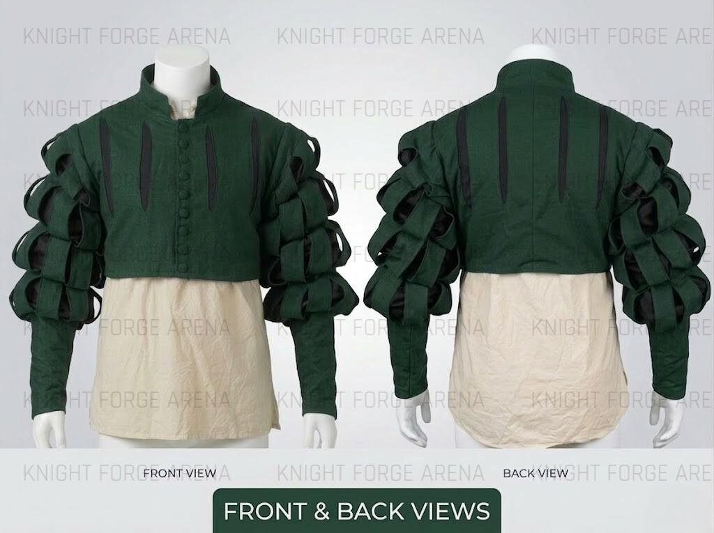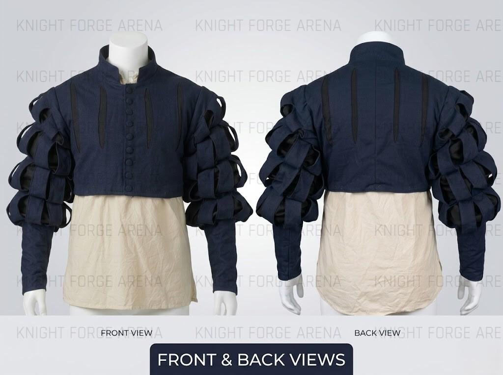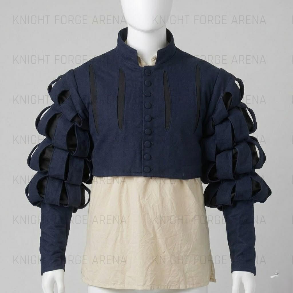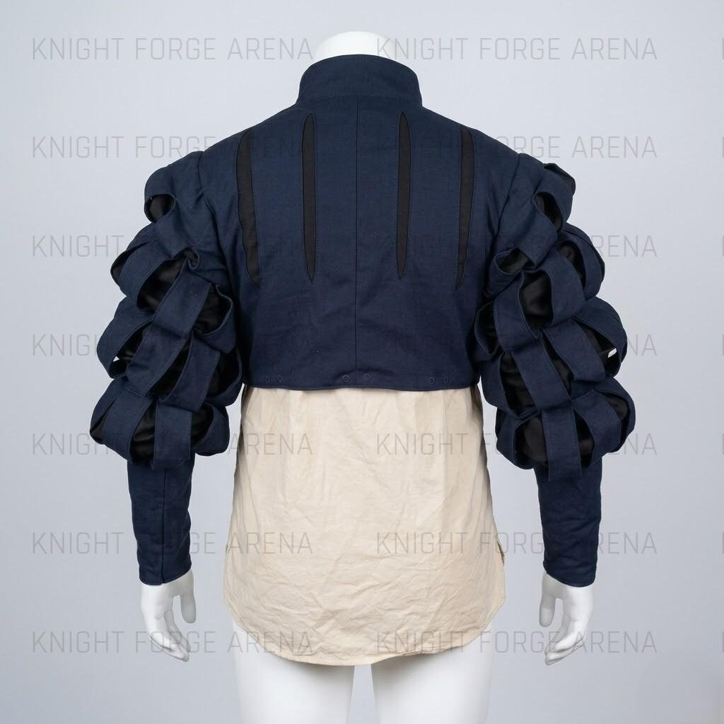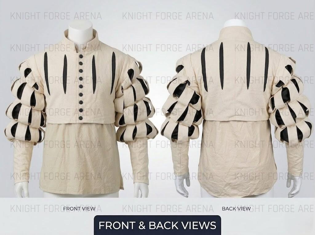 Iconic Slashed Design: Features vertical chest slashes and multi-tiered “puff” sleeves, revealing a contrasting inner layer for a bold, high-status look.